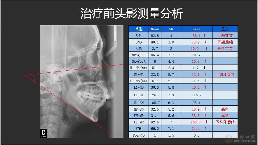 高角病例即是下颌平面(MP)和眼耳平面(FH)的交角就是下颌平面角大于32°,这个角的正常值是三十度左右,此次参赛获奖病例的下颌平面角达到38.6°,远大于正常值,属于高角病例。此类病例多为窄长脸型,两侧下颌角不明显,开唇露齿。据熊小琴主任介绍,这位患者想要解决牙齿拥挤不齐及面型凸度,常规解决方案一般是通过正颌手术和拔牙解决。但患者向熊小琴主任反应,不愿意接受手术、也不愿意拔除前磨牙。