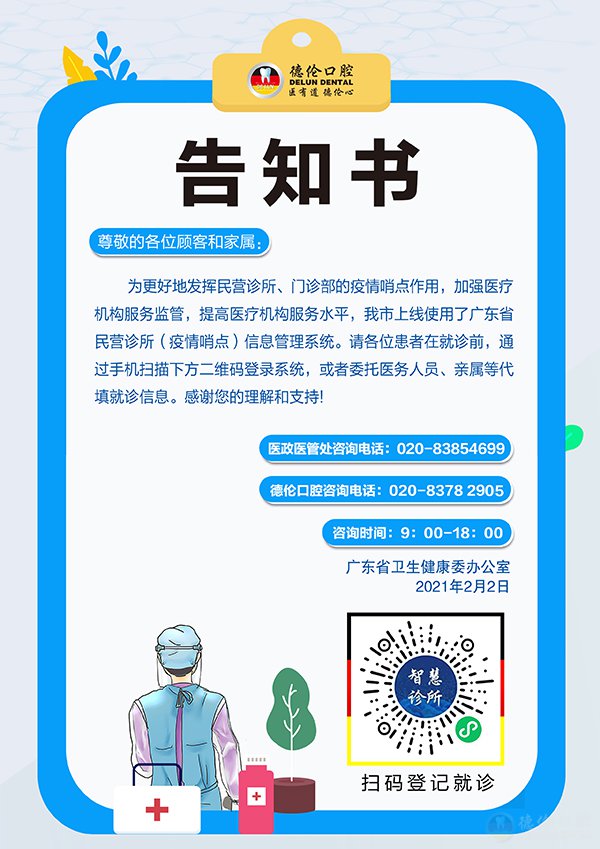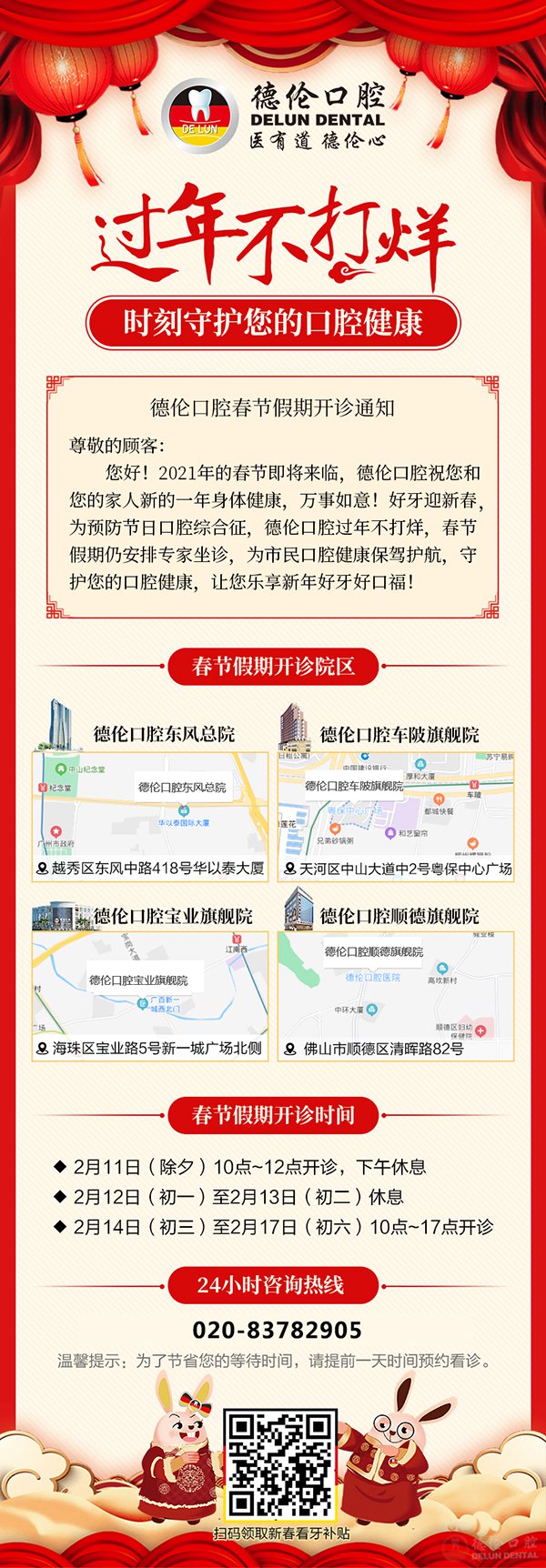 新年到来之际,为了方便顾客朋友在春节期间正常预约就诊,德伦口腔部分院点正常开诊,坚持守护您全家口腔健康。