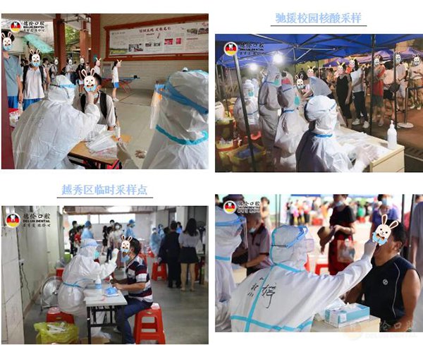 截至目前,德伦口腔派出近百人次驰援越秀区广州机务段综合体育场、越秀区小马站、越秀区沙涌南综合市场、越秀区体育馆、海珠区琶洲安置新社区等多个临时采样点进行核酸采样工作。