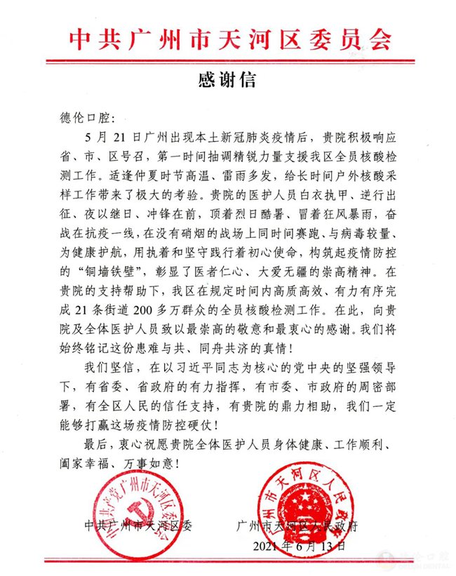 ——中共天河区委员会致德伦口腔感谢信