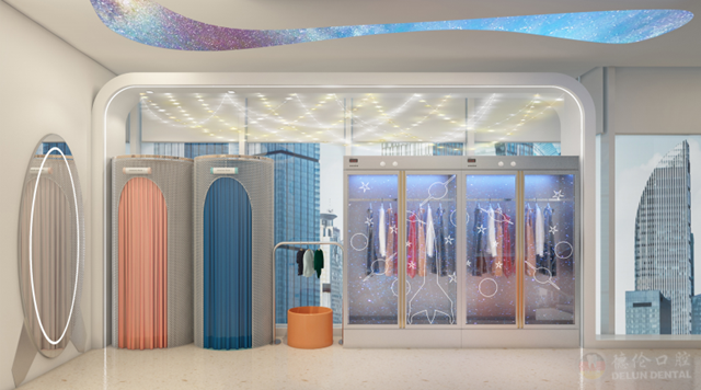 德伦口腔儿童口腔医院门诊别于传统口腔医院,门诊主体大楼整个色调以蓝灰为主基调颜色,墙面及顶面的图案及颜色符合儿童的喜好,色彩采用冷色调,如科技蓝、浅灰等,凸显出宇宙科技感,缓解就诊患儿不安情绪。