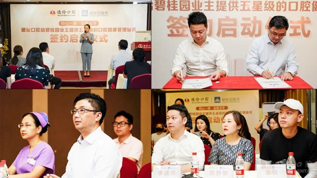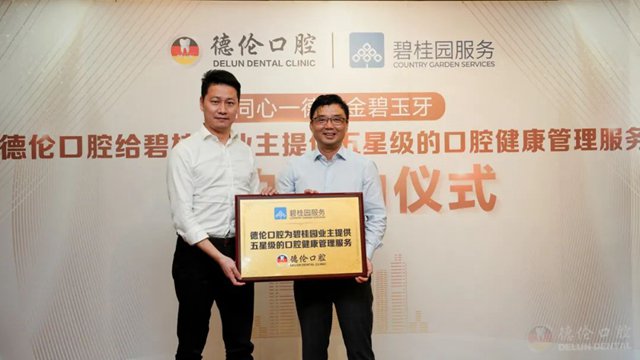 2022年8月10日,广东德伦口腔集团与碧桂园服务联合举办“同心一德•金碧玉牙”——战略合作签约仪式在东风总院隆重举行。德伦口腔董事长黄维通、战略与碧桂园创新管理中心总经理李迪昇等领导出席本次发布会,双方领导在发布会上正式签署合作协议,建立全面的战略合作伙伴关系。
